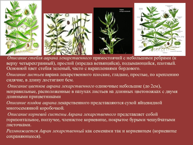 Слайд 4 Описание стебля аврана лекарственного прямостоячий с небольшими ребрами (к верху
