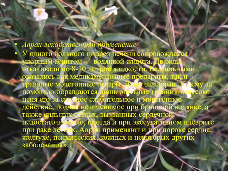 водянкой живота. Дважды откачивали по 8-10 литров жидкости. Бессильными оказались как медикаментозные препараты, так и травяные мочегонные отвары. Выручил авран. К нему за помощью обращаются лишь опытные травники, высоко ценя его за сильное слабительное и мочегонное действие, подчас незаменимое при брюшной водянке, а также сильных отёках, вызванных сердечной недостаточностью, иногда и при экссудативном плеврите при раке лёгких. Авран применяют и при пороке сердца, желтухе, психических, кожных и некоторых других заболеваниях.