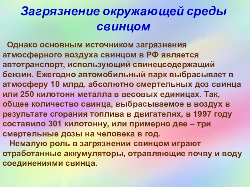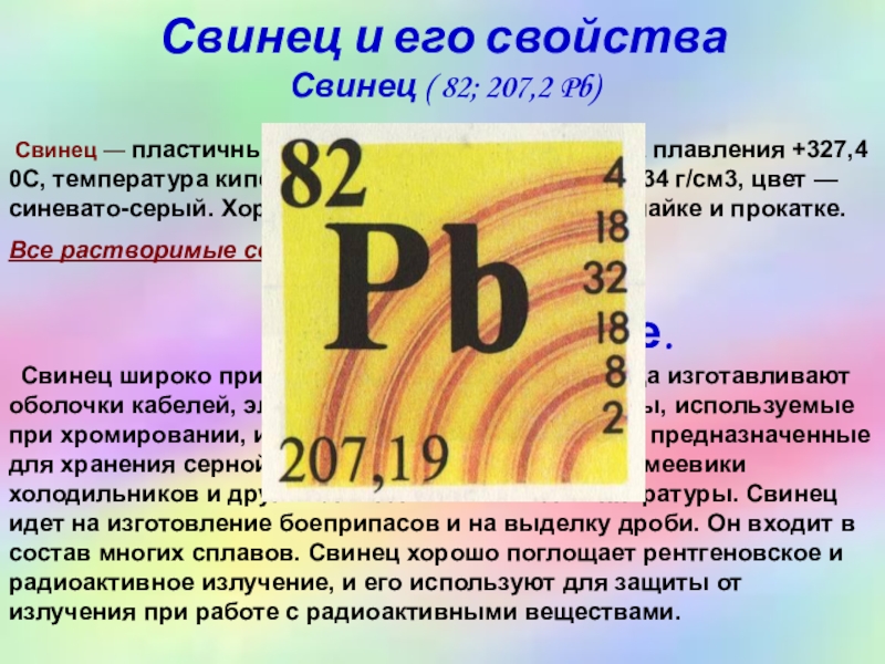 Свинец широко применяется в наши дни. Из свинца изготавливают оболочки кабелей, электроды аккумуляторов, аноды, используемые при хромировании, им покрывают изнутри сосуды, предназначенные для хранения серной кислоты, также изготовляют змеевики холодильников и другие ответственные части аппаратуры. Свинец идет на изготовление боеприпасов и на выделку дроби. Он входит в состав многих сплавов. Свинец хорошо поглощает рентгеновское и радиоактивное излучение, и его используют для защиты от излучения при работе с радиоактивными веществами.