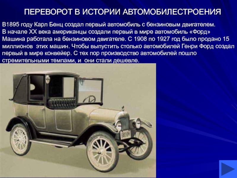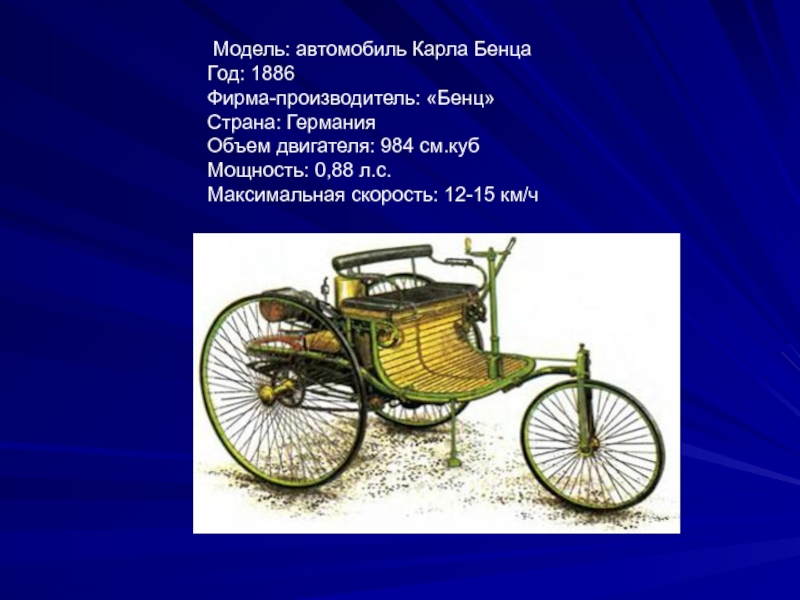 Первый автомобиль работал на паровом двигателе и мог ехать не более 15 минут, пока не заканчивалась вода в котле