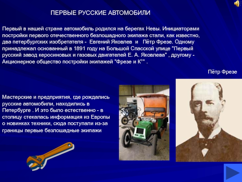 Мастерские и предприятия, где рождались русские автомобили, находились в Петербурге . И это было естественно - в столицу стекалась информация из Европы о новинках техники, сюда поступали из-за границы первые безлошадные экипажи