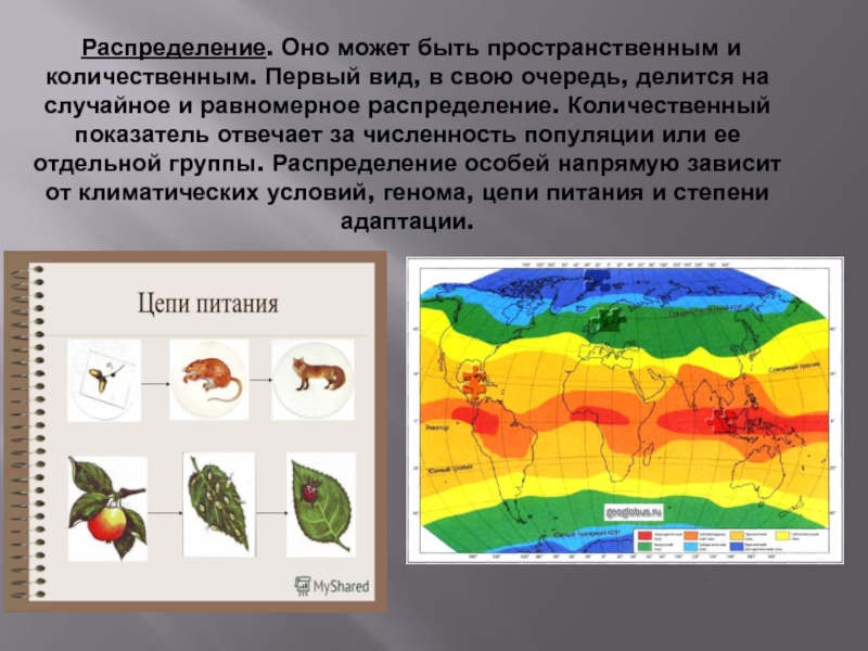 свою очередь, делится на случайное и равномерное распределение. Количественный показатель отвечает за численность популяции или ее отдельной группы. Распределение особей напрямую зависит от климатических условий, генома, цепи питания и степени адаптации.