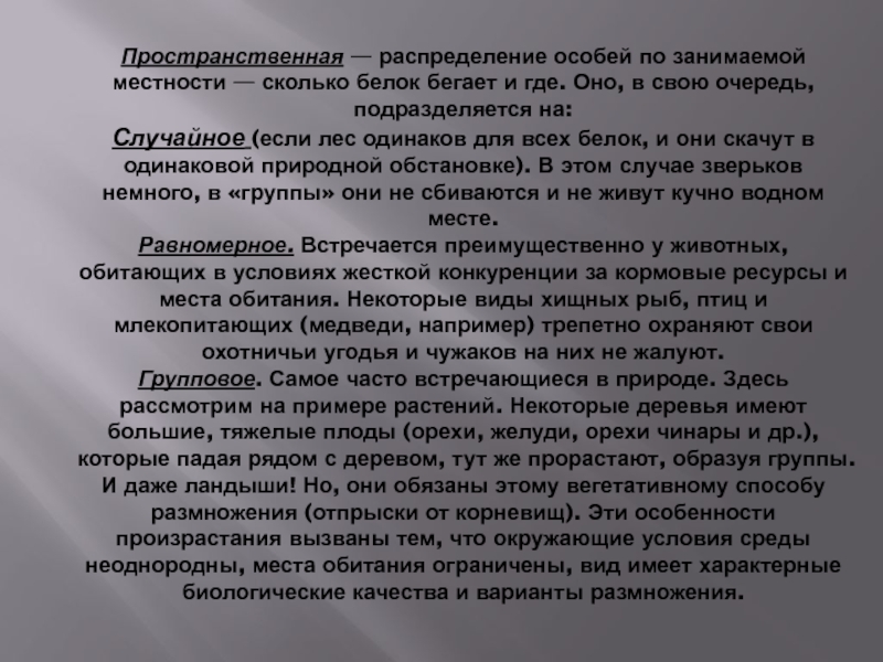 Слайд 5Пространственная — распределение особей по занимаемой местности — сколько белок бегает