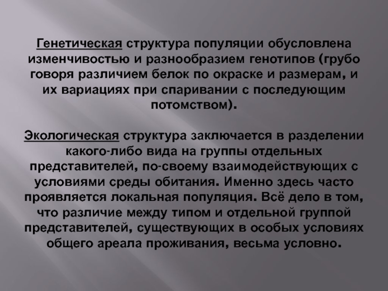 белок по окраске и размерам, и их вариациях при спаривании с последующим потомством). Экологическая структура заключается в разделении какого-либо вида на группы отдельных представителей, по-своему взаимодействующих с условиями среды обитания. Именно здесь часто проявляется локальная популяция. Всё дело в том, что различие между типом и отдельной группой представителей, существующих в особых условиях общего ареала проживания, весьма условно.