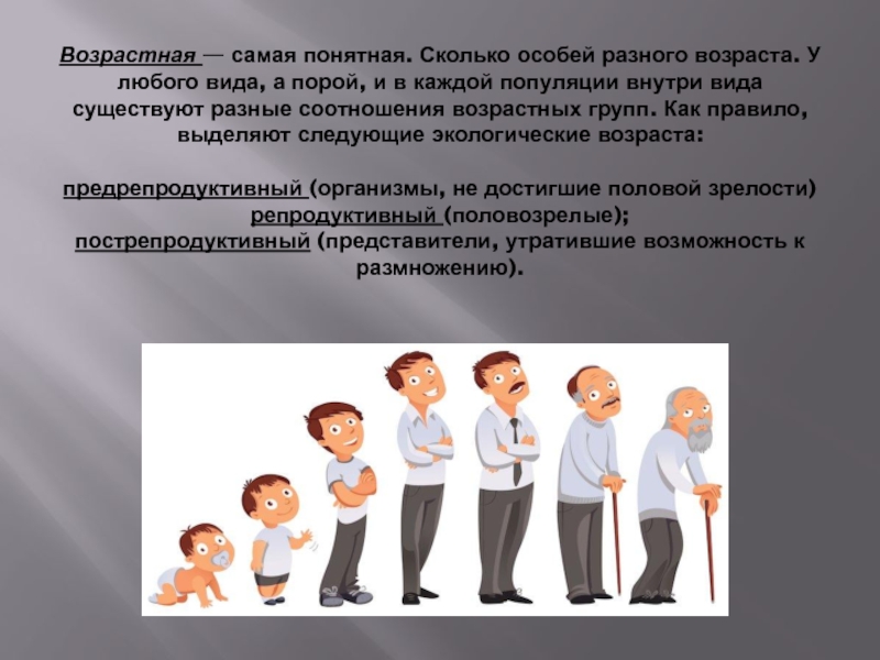 Слайд 4Возрастная — самая понятная. Сколько особей разного возраста. У любого вида,