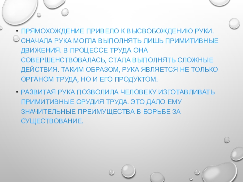 Слайд 11Прямохождение привело к высвобождению руки. Сначала рука могла выполнять лишь примитивные