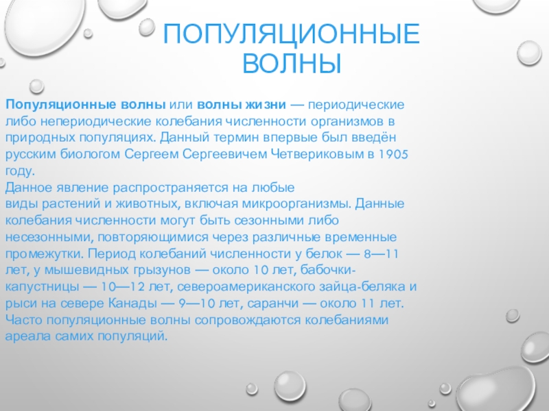 Данное явление распространяется на любые виды растений и животных, включая микроорганизмы. Данные колебания численности могут быть сезонными либо несезонными, повторяющимися через различные временные промежутки. Период колебаний численности у белок — 8—11 лет, у мышевидных грызунов — около 10 лет, бабочки-капустницы — 10—12 лет, североамериканского зайца-беляка и рыси на севере Канады — 9—10 лет, саранчи — около 11 лет. Часто популяционные волны сопровождаются колебаниями ареала самих популяций.