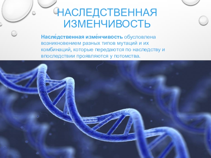 Насле́дственная изме́нчивость обусловлена возникновением разных типов мутаций и их комбинаций, которые передаются