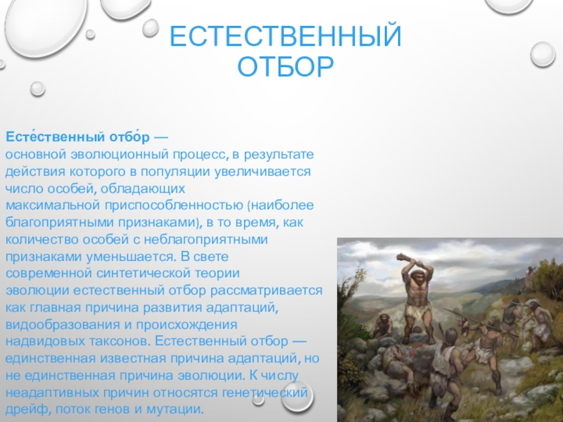 особей, обладающих максимальной приспособленностью (наиболее благоприятными признаками), в то время, как количество особей с неблагоприятными признаками уменьшается. В свете современной синтетической теории эволюции естественный отбор рассматривается как главная причина развития адаптаций, видообразования и происхождения надвидовых таксонов. Естественный отбор — единственная известная причина адаптаций, но не единственная причина эволюции. К числу неадаптивных причин относятся генетический дрейф, поток генов и мутации.