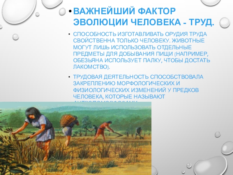Слайд 9Важнейший фактор эволюции человека - труд.