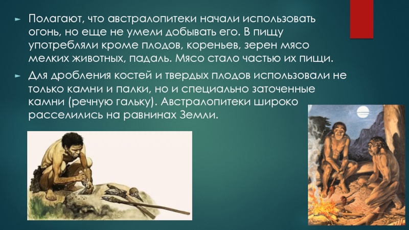 Слайд 5Полагают, что австралопитеки начали использовать огонь, но еще не умели добывать