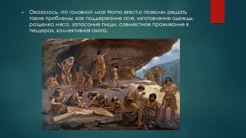 Слайд 15Оказалось, что головной мозг Homo erectus позволял решать такие проблемы, как