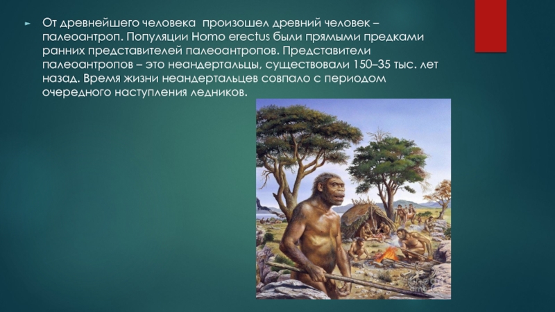 Слайд 10От древнейшего человека произошел древний человек – палеоантроп. Популяции Homo erectus
