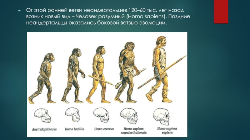 Слайд 13От этой ранней ветви неандертальцев 120–60 тыс. лет назад возник новый