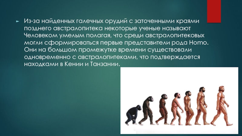Слайд 6Из-за найденных галечных орудий с заточенными краями позднего австралопитека некоторые ученые