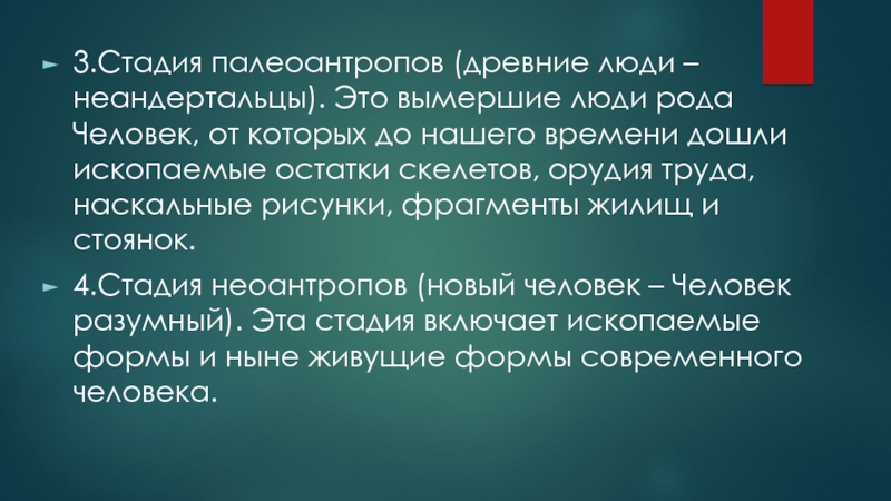 4.Стадия неоантропов (новый человек – Человек разумный). Эта стадия включает ископаемые формы и ныне живущие формы современного человека.