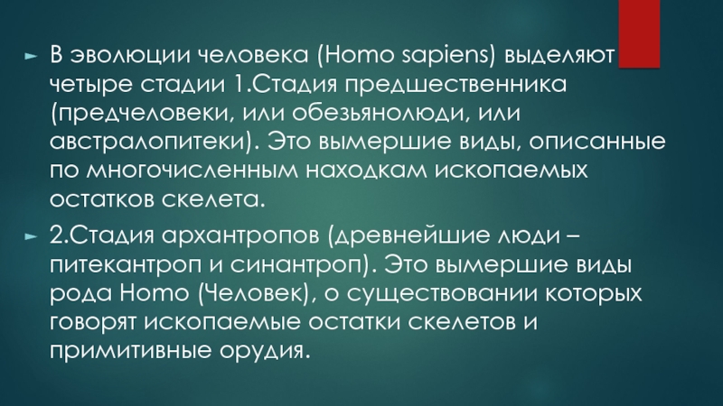 Слайд 7В эволюции человека (Homo sapiens) выделяют четыре стадии 1.Стадия предшественника (предчеловеки,