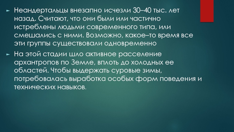 Слайд 14Неандертальцы внезапно исчезли 30–40 тыс. лет назад. Считают, что они были