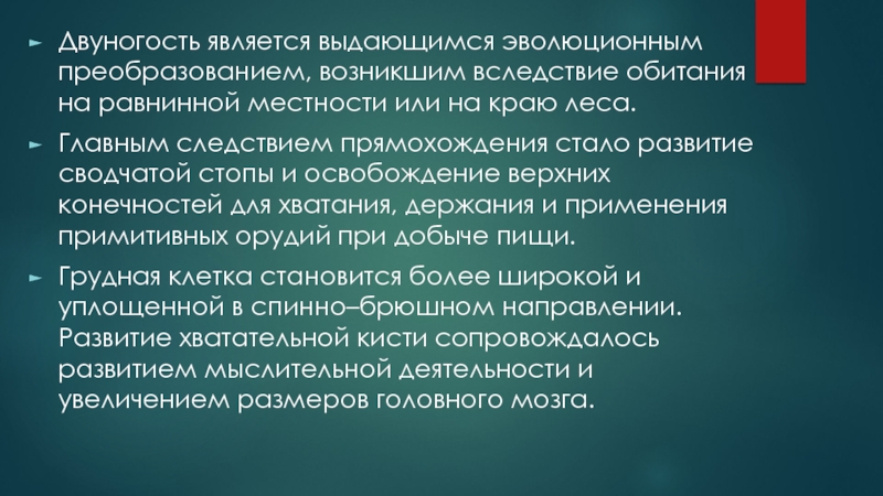 Слайд 4Двуногость является выдающимся эволюционным преобразованием, возникшим вследствие обитания на равнинной местности
