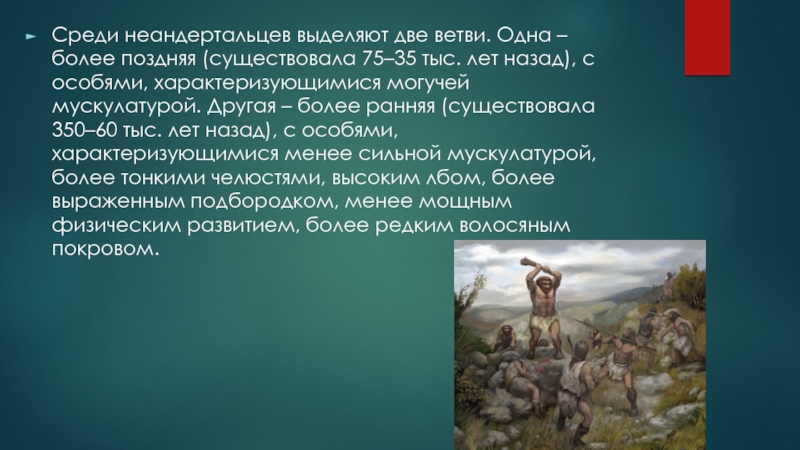 Слайд 12Среди неандертальцев выделяют две ветви. Одна – более поздняя (существовала 75–35