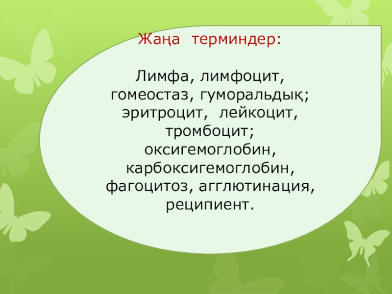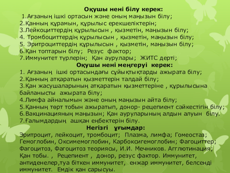 Эритроцит, лейкоцит, тромбоцит; Плазма, лимфа; Гомеостаз;Гемоглобин, Оксимемоглобин, Карбоксигемоглобин; Фагоциттер; Фагоцитоз, Фагоцитоз теориясы, И.И. Мечников. Агглютинация; Қан тобы. , Рецепиент , донор, резус фактор. Иммунитет, антиденелер,туа біткен иммунитет, енжар иммунитет, белсенді иммунитет. Емдік қан сарысуы.