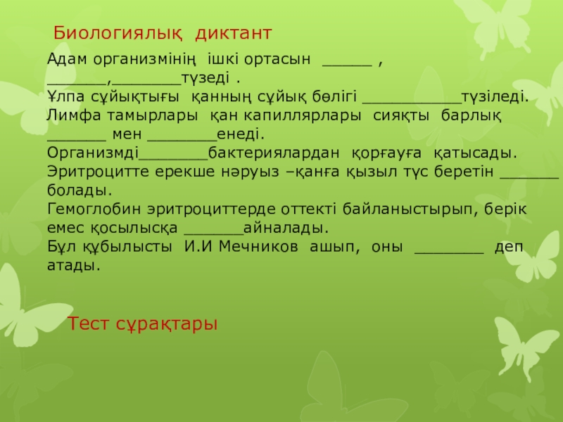 1.Білімділік оҚУШЫЛАРҒА АҒЗАНЫҢ ІШКІ ОРТАСЫ ТУРАЛЫ ТОЛЫҚ МАҒЛҰМАТ АЛУ ;ҚАННЫҢ ҚҰРАМЫН, ҚЫЗМЕТІН БІЛУ