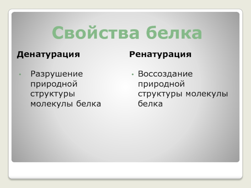 Свойства белкаДенатурацияРенатурацияРазрушение природной структуры молекулы белкаВоссоздание природной структуры молекулы белка