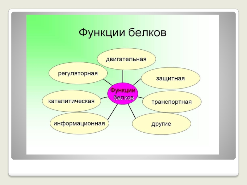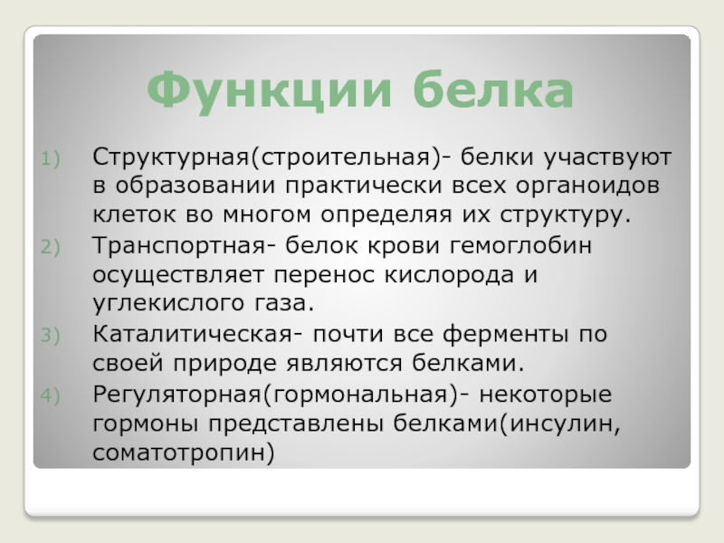 Функции белкаСтруктурная(строительная)- белки участвуют в образовании практически всех органоидов клеток во многом определяя их структуру.Транспортная- белок крови
