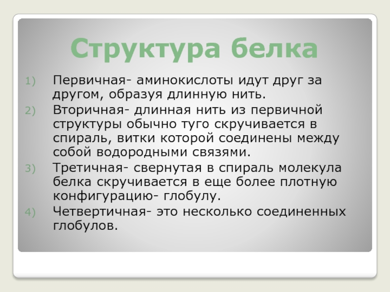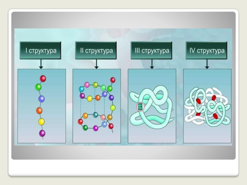 Структура белкаПервичная- аминокислоты идут друг за другом, образуя длинную нить.Вторичная- длинная нить из первичной структуры обычно туго