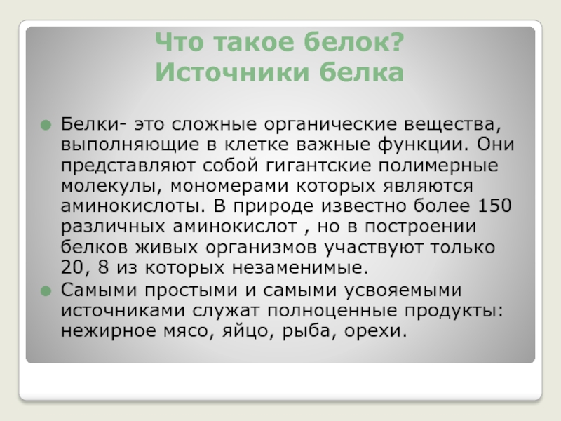 Что такое белок? Источники белкаБелки- это сложные органические вещества, выполняющие в клетке важные функции. Они представляют собой гигантские полимерные молекулы, мономерами которых являются аминокислоты. В природе известно более 150 различных аминокислот , но в построении белков