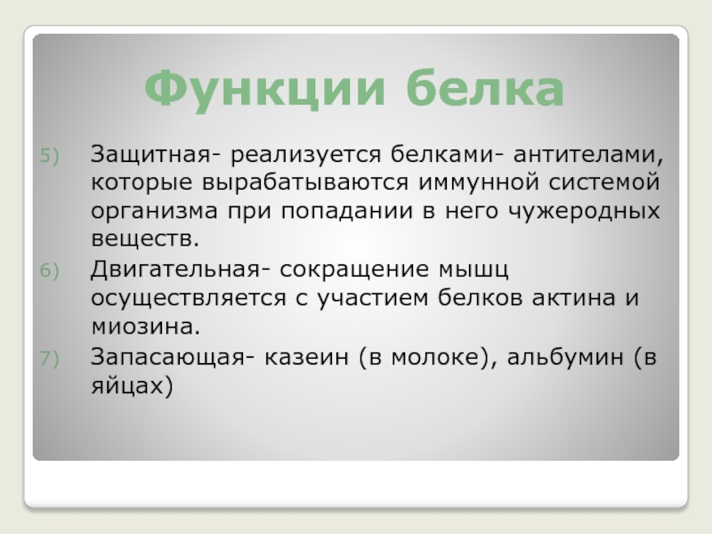 Функции белкаЗащитная- реализуется белками- антителами, которые вырабатываются иммунной системой организма при попадании в него чужеродных веществ.Двигательная- сокращение