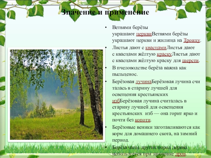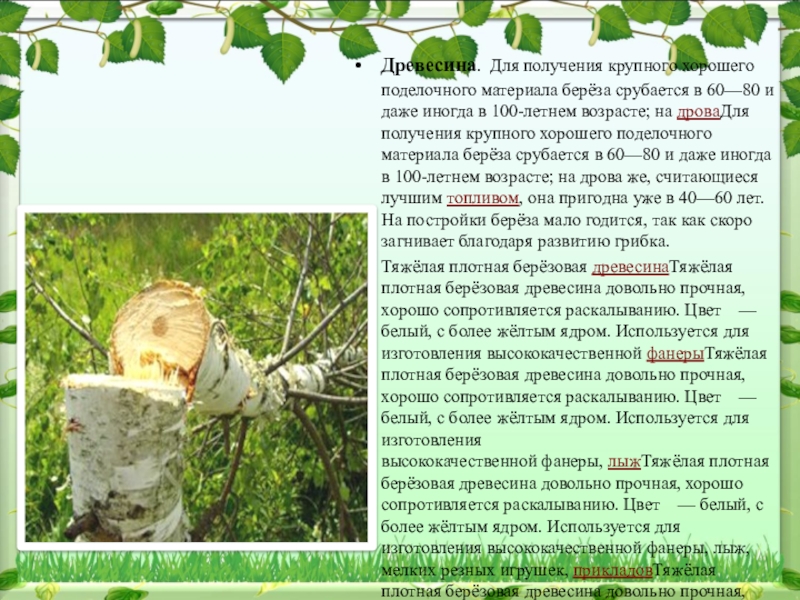 Слайд 10Древесина. Для получения крупного хорошего поделочного материала берёза срубается в 60—80 и