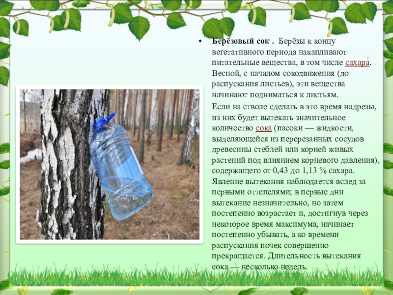 Берёзовый сок . Берёзы к концу вегетативного периода накапливают питательные вещества,