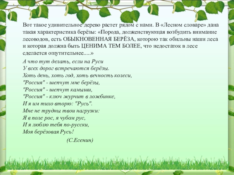 В «Лесном словаре» дана такая характеристика берёзы: «Порода, долженствующая возбудить внимание лесоводов, есть ОБЫКНОВЕННАЯ БЕРЁЗА, которою так обильны наши леса и которая должна быть ЦЕНИМА ТЕМ БОЛЕЕ, что недостаток в лесе сделается ощутительнее.....»