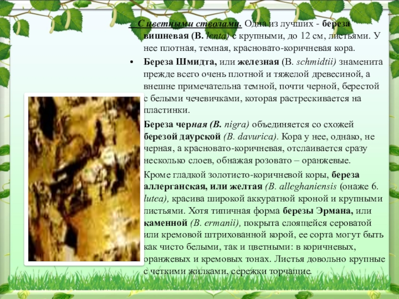 Слайд 6 С цветными стволами. Одна из лучших - береза вишневая