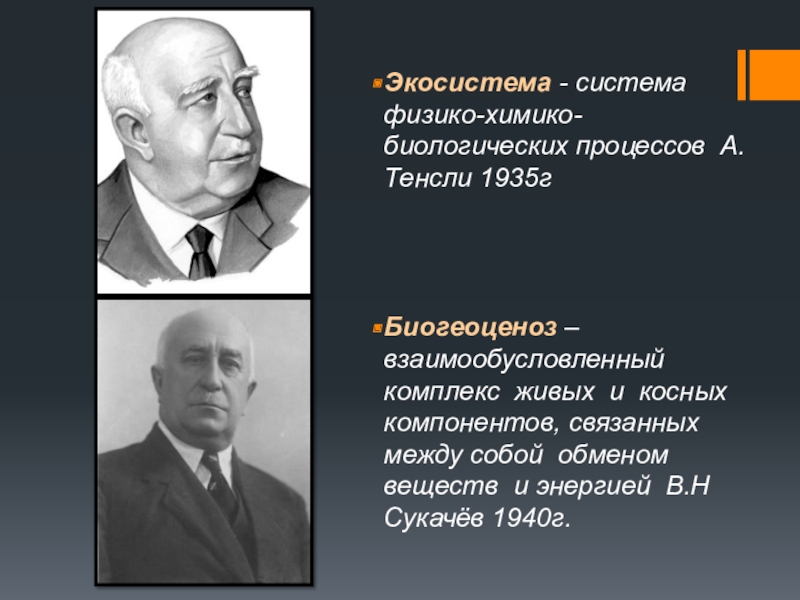 Экосистема - система физико-химико-биологических процессов А.Тенсли 1935гБиогеоценоз – взаимообусловленный комплекс живых и косных компонентов, связанных между собой