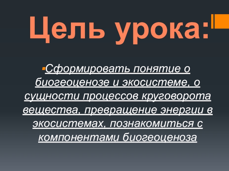Цель урока: Сформировать понятие о биогеоценозе и экосистеме, о сущности процессов круговорота вещества, превращение энергии в экосистемах,
