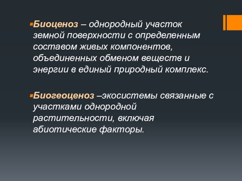 Слайд 10Биоценоз – однородный участок земной поверхности с определенным составом живых компонентов,