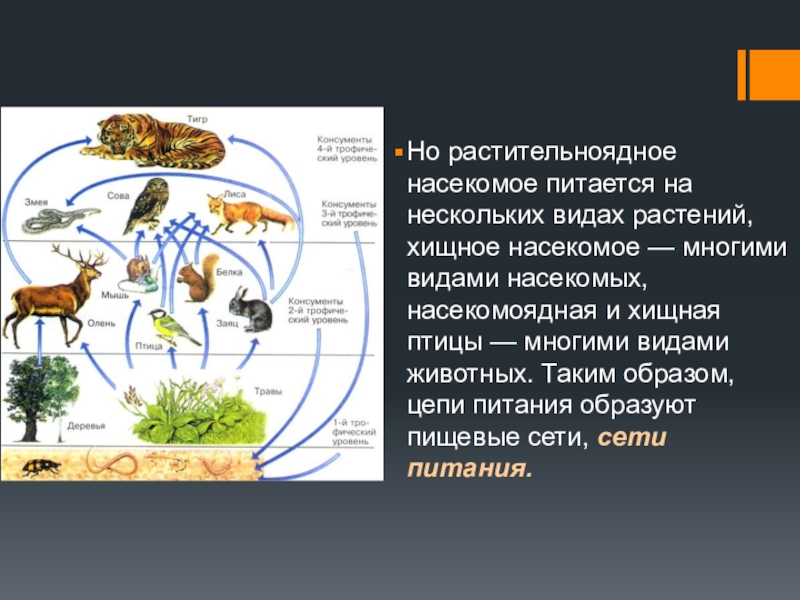 многими видами насекомых, насекомоядная и хищная птицы — многими видами животных. Таким образом, цепи питания образуют пищевые сети, сети питания.