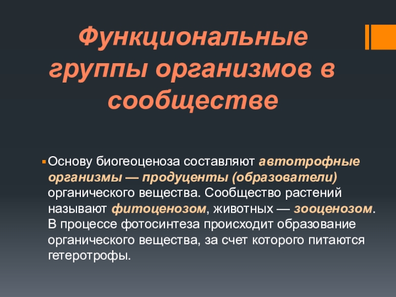 Функциональные группы организмов в сообществеОснову биогеоценоза составляют автотрофные организмы — продуценты (образователи) органического вещества. Сообщество растений называют
