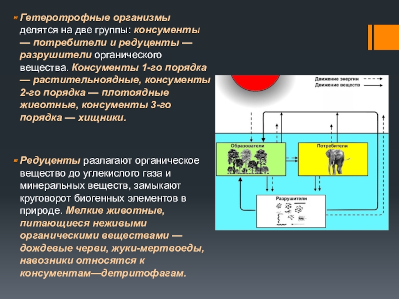 Гетеротрофные организмы делятся на две группы: консументы — потребители и редуценты — разрушители органического вещества. Консументы 1-го