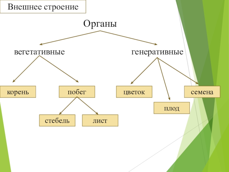 ОрганывегетативныегенеративныеВнешнее строениекореньпобегстебельлистцветокплодсемена