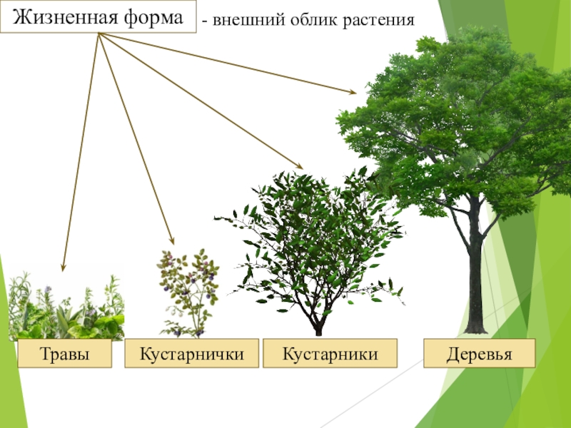 Жизненная форма- внешний облик растенияДеревьяКустарникиКустарничкиТравы