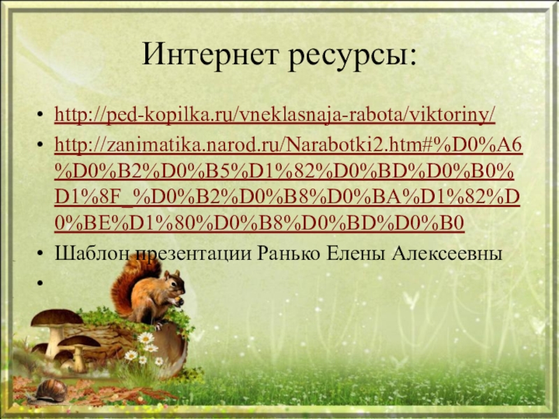 Интернет ресурсы:http://ped-kopilka.ru/vneklasnaja-rabota/viktoriny/http://zanimatika.narod.ru/Narabotki2.htm#%D0%A6%D0%B2%D0%B5%D1%82%D0%BD%D0%B0%D1%8F_%D0%B2%D0%B8%D0%BA%D1%82%D0%BE%D1%80%D0%B8%D0%BD%D0%B0Шаблон презентации Ранько Елены Алексеевны