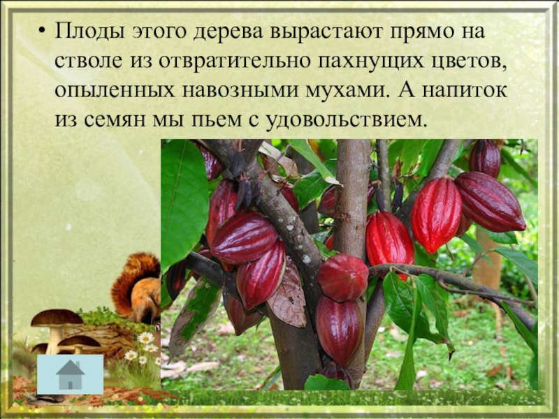 Плоды этого дерева вырастают прямо на стволе из отвратительно пахнущих цветов, опыленных навозными мухами. А напиток из
