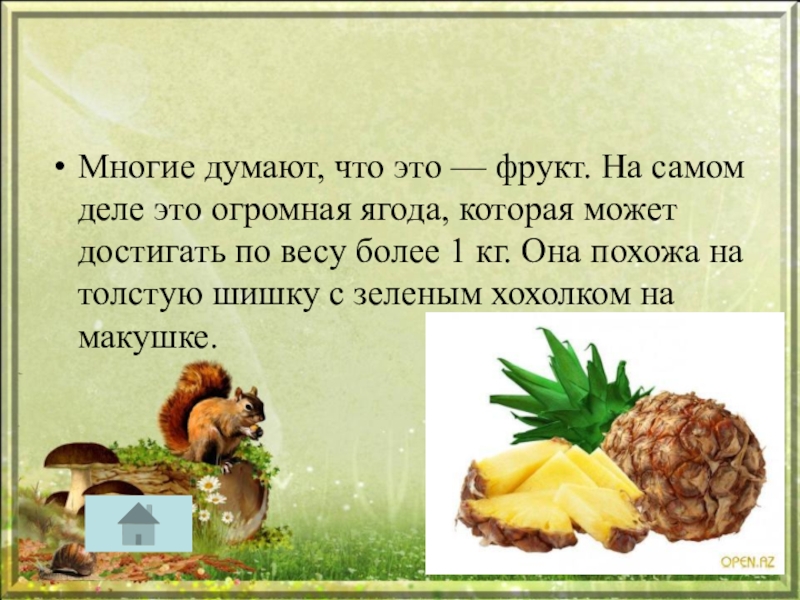 ягода, которая может достигать по весу более 1 кг. Она похожа на толстую шишку с зеленым хохолком на макушке.