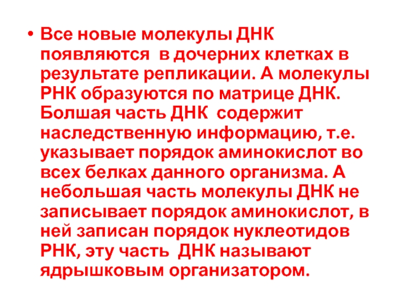 А молекулы РНК образуются по матрице ДНК. Болшая часть ДНК содержит наследственную информацию, т.е. указывает порядок аминокислот во всех белках данного организма. А небольшая часть молекулы ДНК не записывает порядок аминокислот, в ней записан порядок нуклеотидов РНК, эту часть ДНК называют ядрышковым организатором.