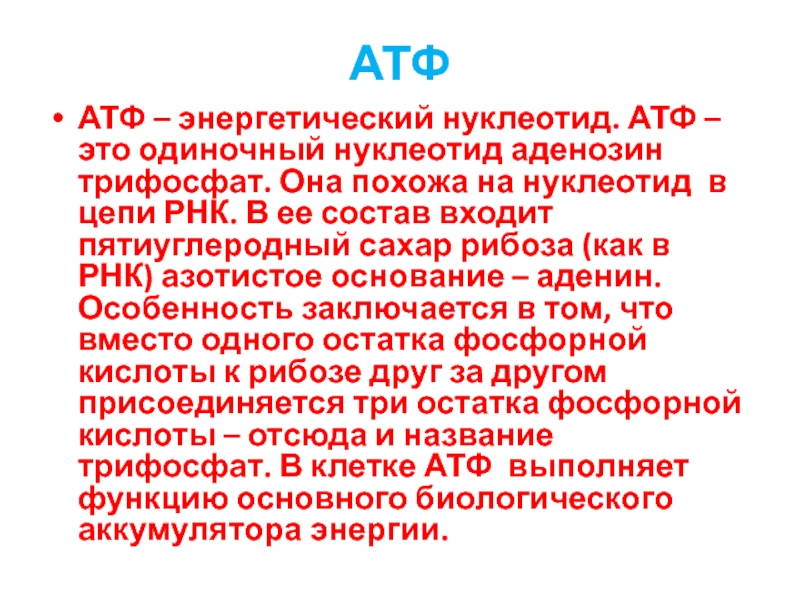 АТФ – энергетический нуклеотид. АТФ – это одиночный нуклеотид аденозин трифосфат.