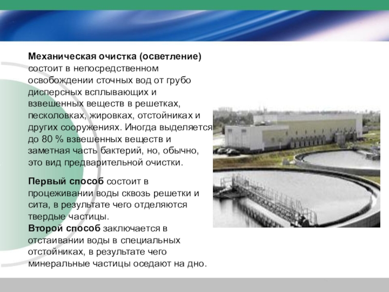 Первый способ состоит в процеживании воды сквозь решетки и сита, в результате чего отделяются твердые частицы.