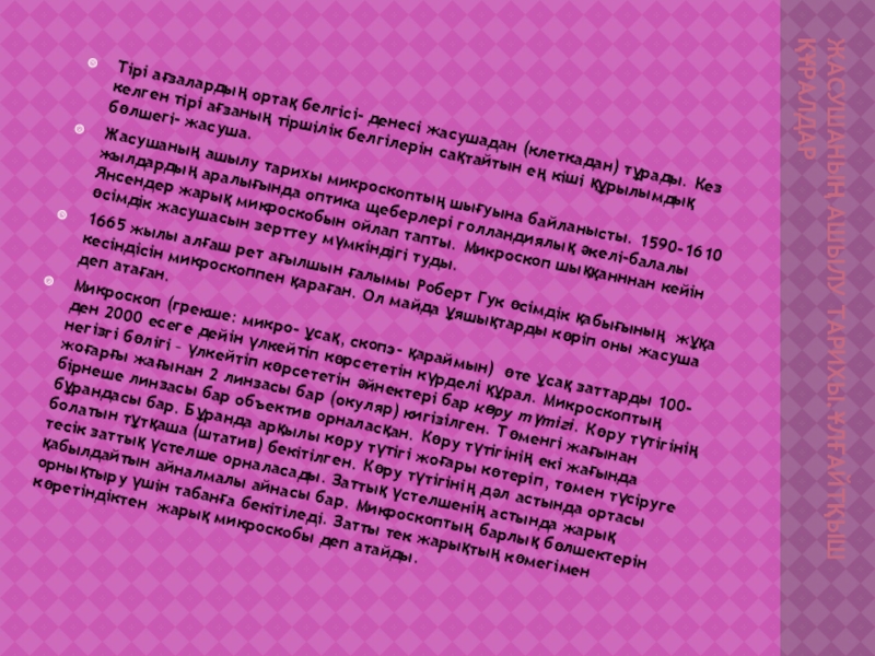 Слайд 2Жасушаның ашылу тарихы.Ұлғайтқыш құралдар